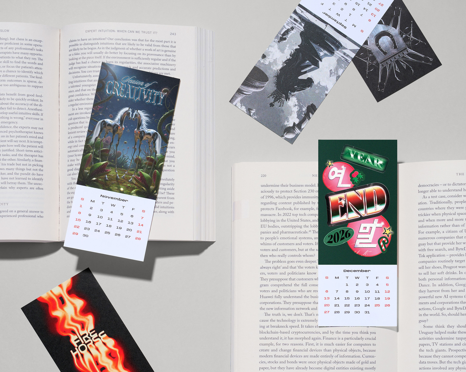To extend its usability and reduce waste, each page was designed to be repurposed as a bookmark, incorporating a sense of circular practicality. The final outcome was also used as externally shared creative content, offering a unique 2026 graphic experience infused with the designers’ individual identities.